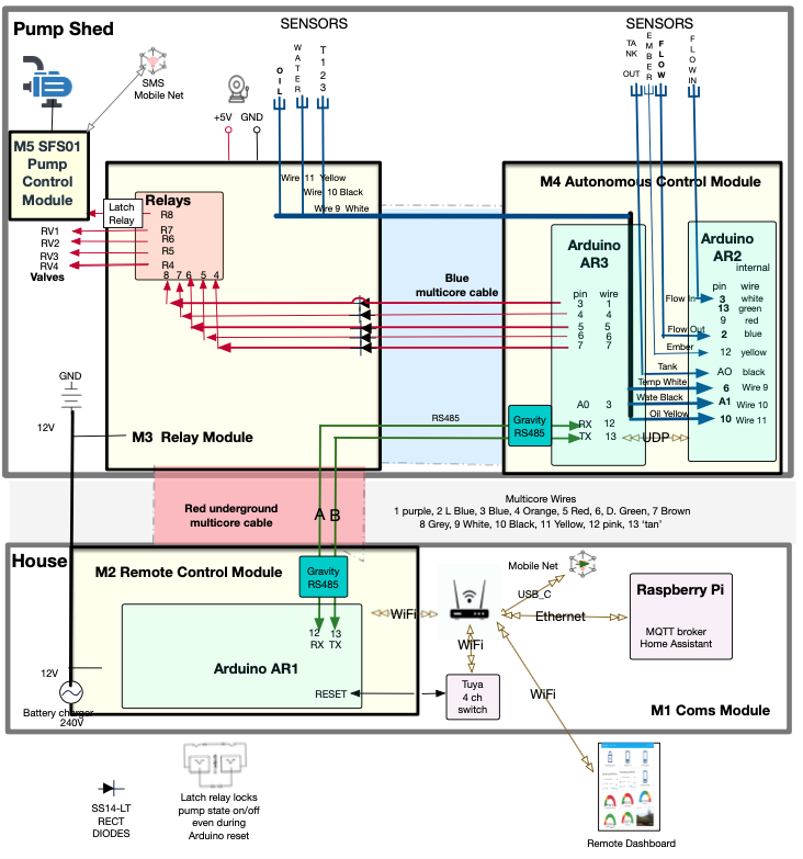 Module 5: Pump Control Module consists of the Small Farm Systems SFS01 commercial pump controller, a dedicated unit responsible solely for managing the diesel pump motor. This controller receives input from both Arduino AR3 via a relay connection and from SMS commands over the mobile network. The dual control paths ensure that the pump can be commanded even if the local control system experiences complete failure, while the commercial nature of this controller provides tested, reliable pump management including safety interlocks and protection against improper operation.