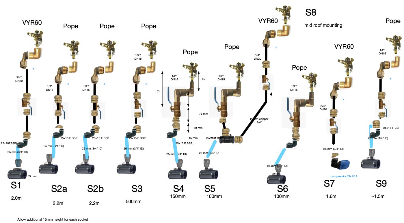 ARMAC's design philosophy recognizes that most houses destroyed in bushfires succumb to ember attack either before or after the fire front passes, rather than during the brief 15-30 minute fire front transit itself. This observation drives the system toward intermittent operation at lower flow rates over extended periods, rather than massive water application during a short window. The standoff impact sprinkler approach allows comprehensive surface wetting including difficult-to-reach areas beneath eaves, while adjustable spray patterns enable precise targeting of vulnerable surfaces. The system operates in five distinct modes ranging from gravity-fed shed cooling (minimal water use) through intermittent low-volume spray (hours of coverage) to continuous high-volume defence (with a delivery time of about 30 min), with each mode appropriate to different threat conditions.
